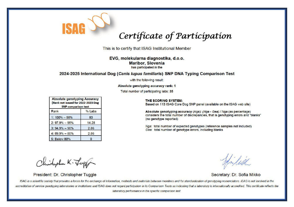 Laboratorij redno sodeluje v mednarodnem primerjalnem testu kvalitete rezultatov, ki ga vsaki 2 leti organizira združenje ISAG (International Society of Animal Genetics). Na zadnjem testu 2024-2025 se je laboratorij EVG uvrstil v najvišji kvalitetni razred. Zadnji certifikat: